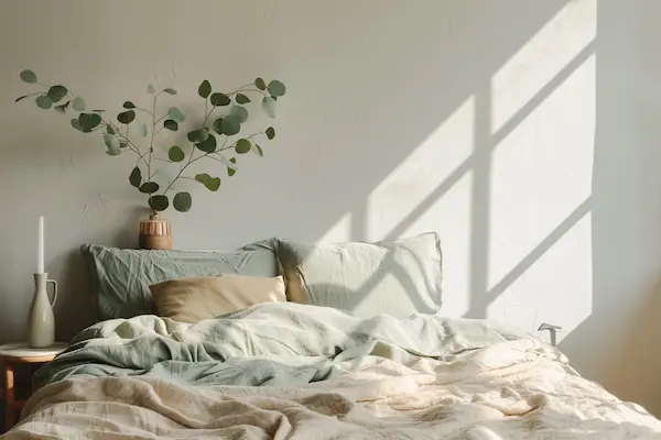 Minimalist, airy AI-generated bedrooms with pastel bedding, a tall eucalyptus plant, and clean-lined wooden furniture—evoking calm and softness.