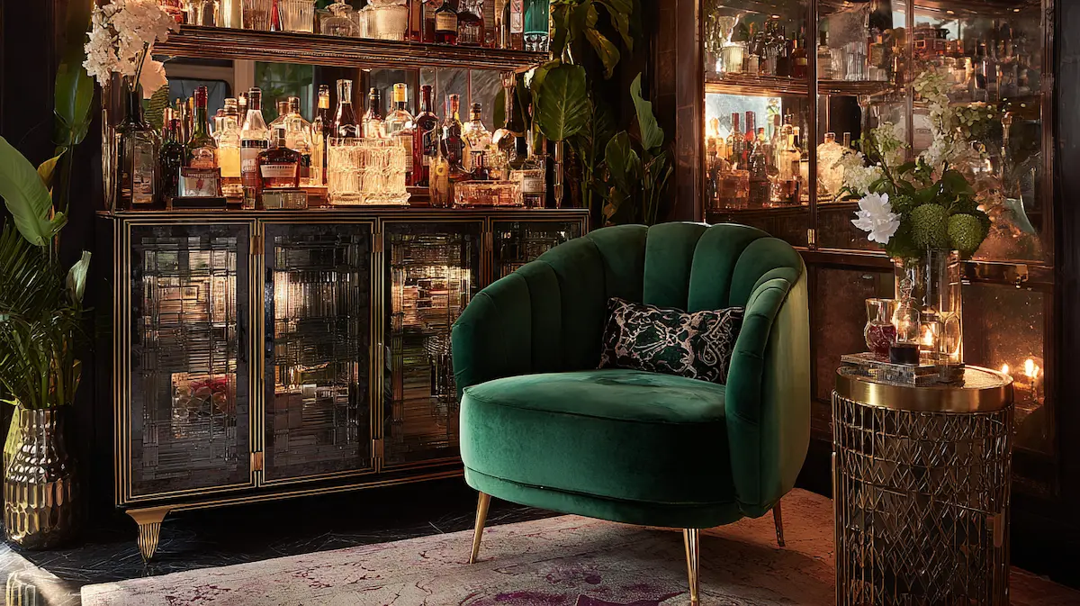 This look channels the indulgent allure of a 1920s cocktail lounge. Imagine an emerald velvet armchair tucked beside a mirrored cabinet stocked with your favorite spirits. Smoked glass shelves display barware, while a soft rug grounds the space with warmth. Add a round brass tray holding elegant glassware and sculptural vases for a touch of glamour.
