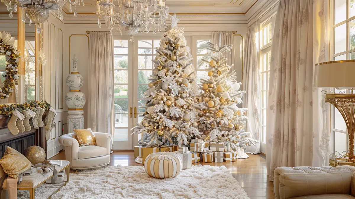 For a luxurious holiday statement, opt for a palette of gold, champagne, and ivory. This glamorous Christmas tree sparkles with metallic ornaments, crystal garlands, and golden ribbons. It’s perfect for elegant interiors and festive soirées.