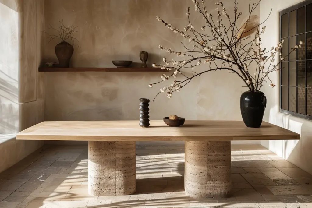 A solid wood dining table paired with a stone base or stone detailing captures the balance that defines Crafted Minimalism. The wooden tabletop brings warmth and tactility through visible grain and subtle movement, while the stone element adds visual weight and stillness beneath. This distribution matters: warmth where people touch, stability where the structure carries load.