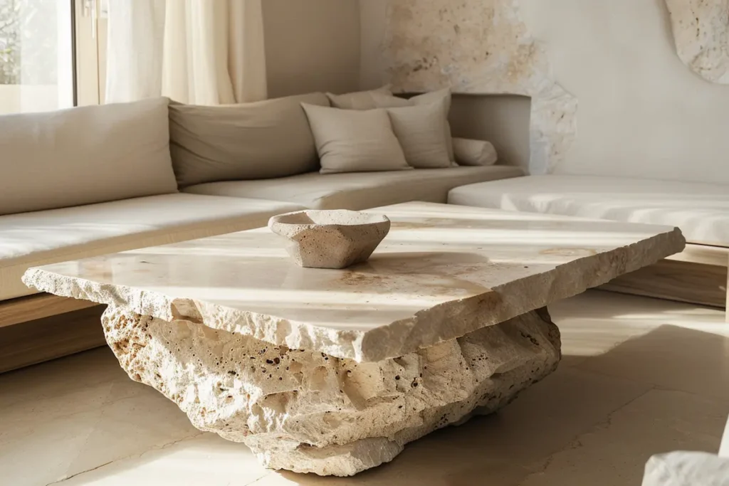 A stone coffee table functions as a visual anchor within a seating area. Its low height and mineral surface slow the eye, creating a stable center around which the rest of the space can settle. When paired with raw wood seating, this stability becomes especially effective.
