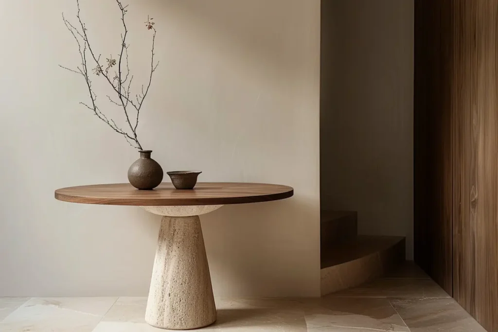 A wood and stone side table or console is often the most subtle way to introduce this material combination into an interior. On a smaller scale, the dialogue between warmth and weight becomes more refined. The stone element provides quiet stability, while the wood surface adds tactility and visual softness.