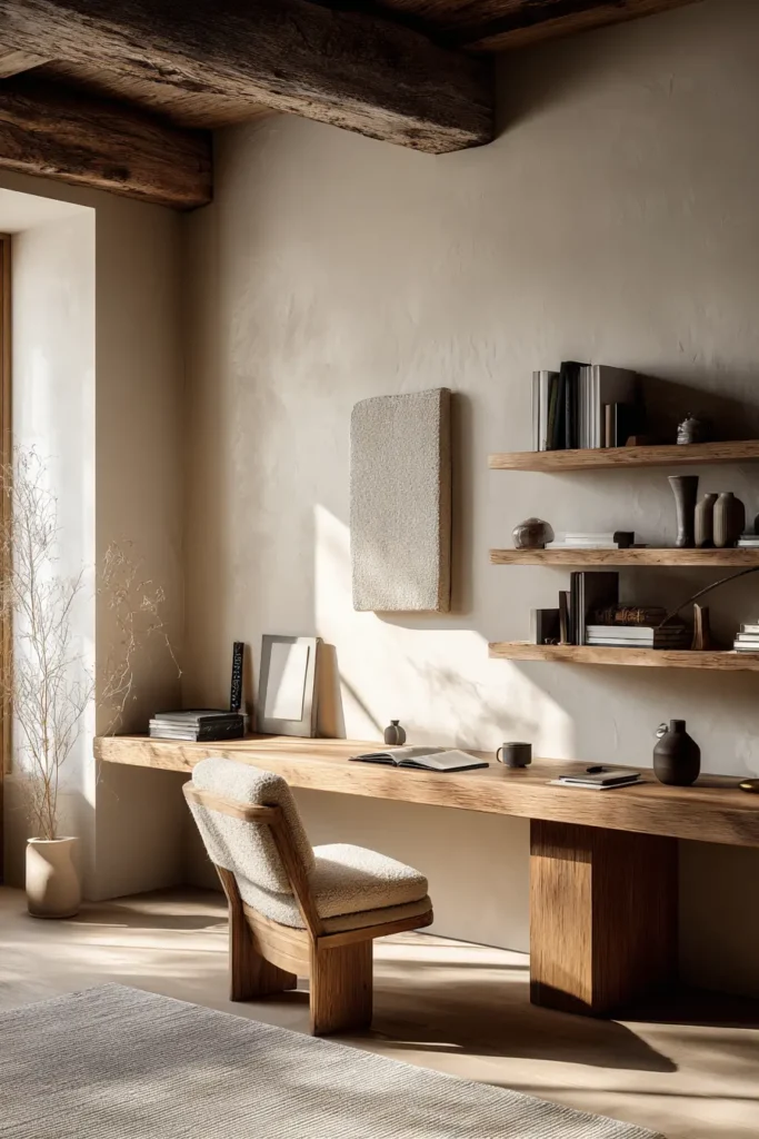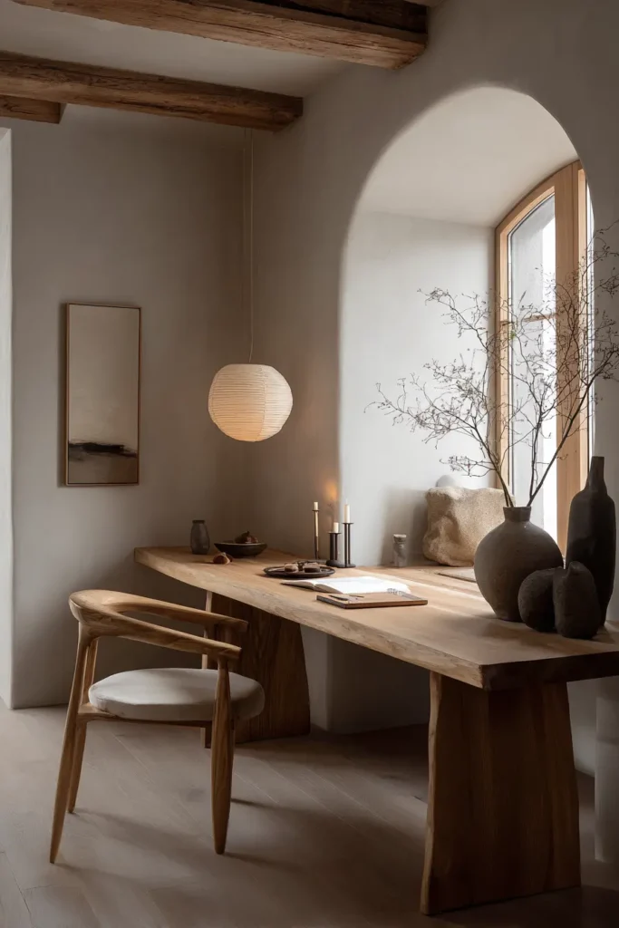 2. Japandi Writing Nook (Low Lines, Soft Wood, Zen Light)