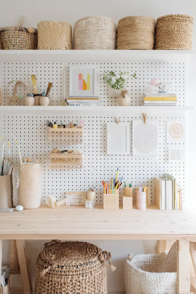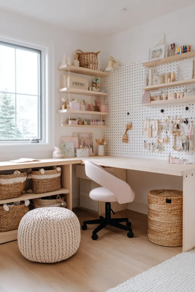 This room is designed for children who love to draw, paint, and invent. Pastel accents add gentle color while keeping the room visually peaceful. Everything has a place — from pegboard craft storage to woven baskets — encouraging creativity and easy cleanup. The result is a space that feels playful and inspiring without ever turning chaotic.