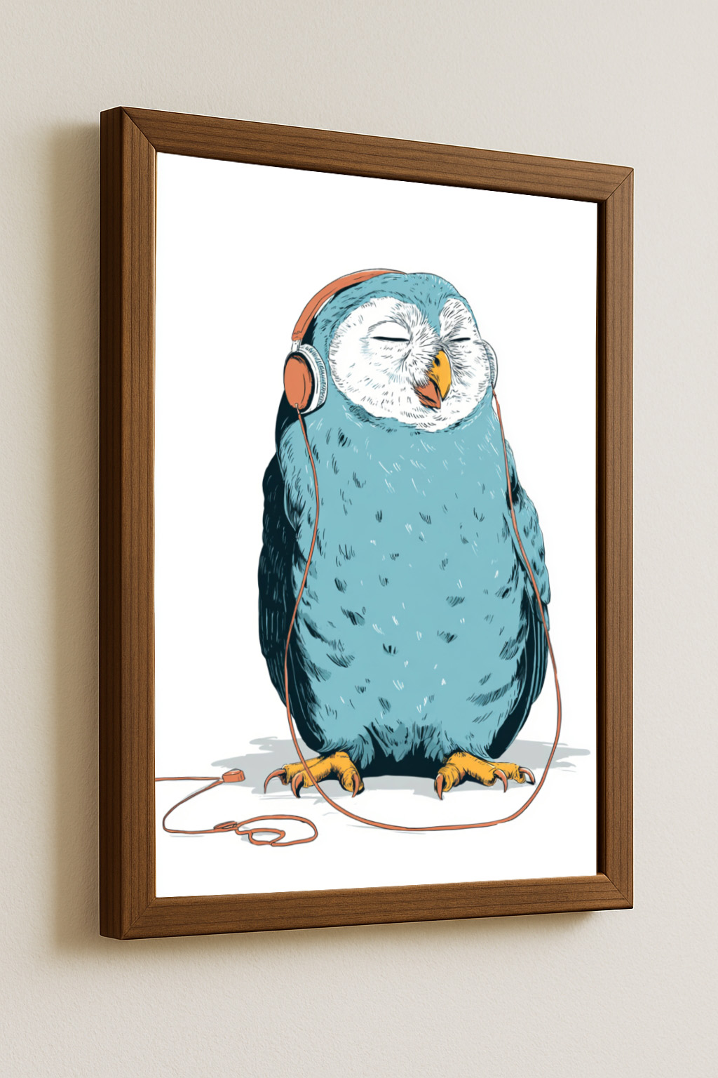 Featuring a peaceful blue owl wearing vintage-style headphones and enjoying its favorite music, this artwork brings a sense of relaxation and positive energy into any space.