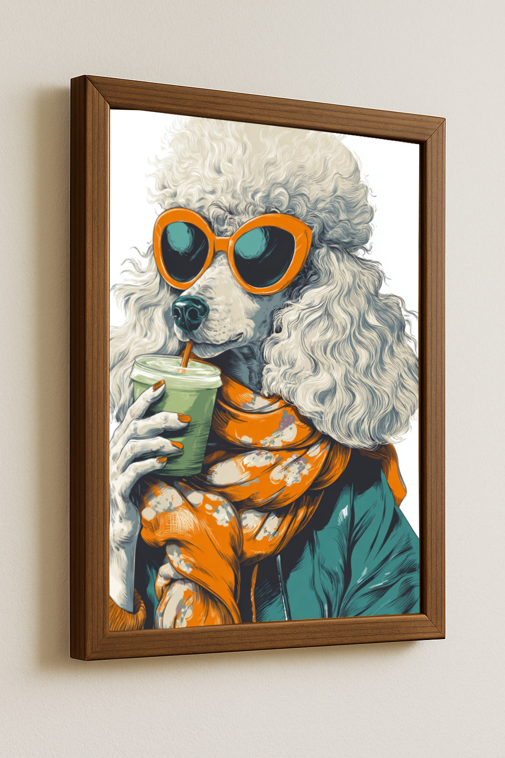 This modern illustration features a glamorous poodle wearing oversized orange sunglasses, a flowing patterned scarf, and sipping a matcha latte — a fun and fashionable statement piece that instantly elevates any room.