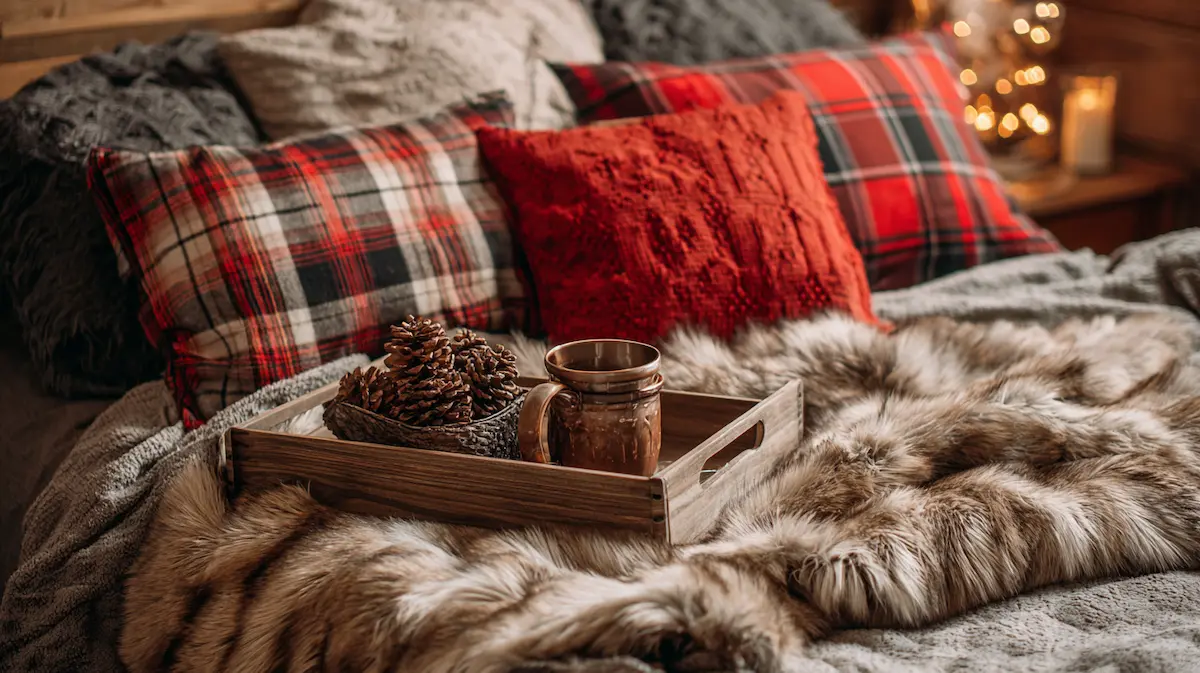 Channel rustic mountain charm with layered textures and warm lighting. Faux-fur blankets, plaid pillows, and LED string lights make any small apartment feel snug. Use removable adhesive hooks to hang lightweight wreaths or stockings. Add a wooden tray with hot cocoa mugs for an instant cabin vibe — cozy, intimate, and renter-safe.