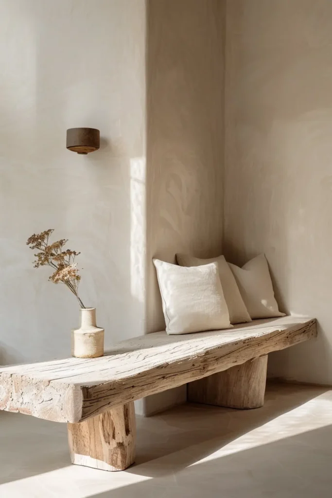 Within Crafted Minimalism, raw wood works best when the form remains simple and the surface is allowed to speak. A table, bench, or low storage piece made from solid wood does not require decorative styling. Its presence is structural rather than ornamental.